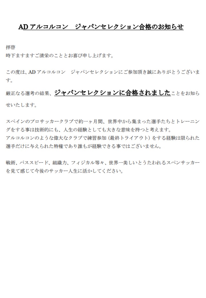 【お知らせ】小園コーチ ADアルコルコン ジャパントライアル合格!! 2021/07/01 みんな大好き小園コーチがなんと!!ADアルコルコンジャパンセレクションに合格しました👏👏 スペインのプロサッカークラブで約一ヶ月間、世界中から集まった選手たちとトレーニングをします。アルコルコンのような偉大なクラブで練習参加をする経験は限られた選手だけ。その中の1人に選ばれた小園コーチ!すごく嬉しいです😊頑張ってください!!おめでとうございます⚽️